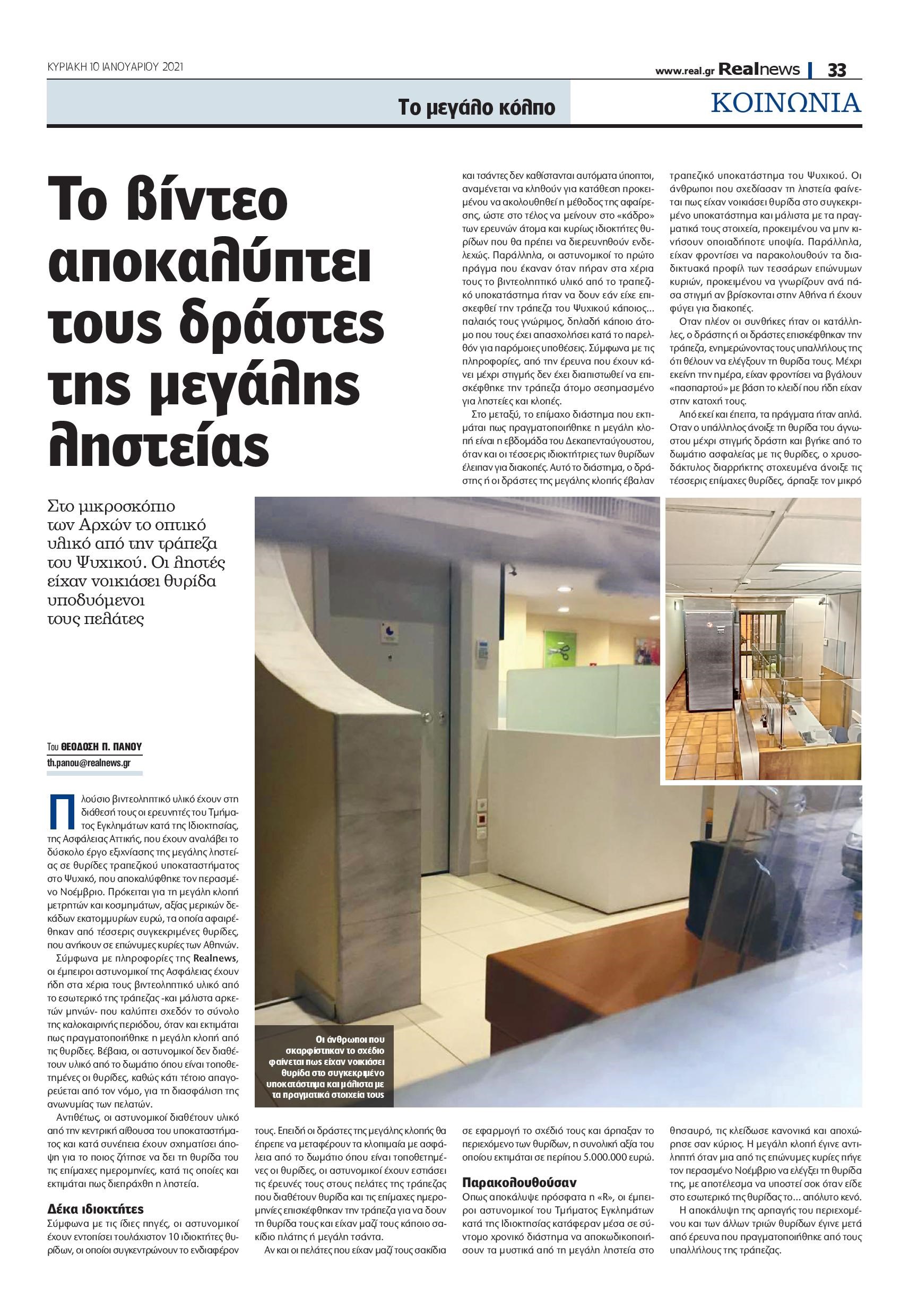 Πλούσιο βιντεοληπτικό υλικό έχουν στη διάθεσή τους οι ερευνητές του Τμήματος Εγκλημάτων κατά της Ιδιοκτησίας, της Ασφάλειας Αττικής, που έχουν αναλάβει το δύσκολο έργο εξιχνίασης της μεγάλης ληστείας σε θυρίδες τραπεζικού υποκαταστήματος στο Ψυχικό, που αποκαλύφθηκε τον περασμένο Νοέμβριο. Πρόκειται για τη μεγάλη κλοπή μετρητών και κοσμημάτων, αξίας μερικών δεκάδων εκατομμυρίων ευρώ, τα οποία αφαιρέθηκαν από τέσσερις συγκεκριμένες θυρίδες, που ανήκουν σε επώνυμες κυρίες των Αθηνών. Σύμφωνα με πληροφορίες της Realnews, οι έμπειροι αστυνομικοί της Ασφάλειας έχουν ήδη στα χέρια τους βιντεοληπτικό υλικό από το εσωτερικό της τράπεζας -και μάλιστα αρκετών μηνών- που καλύπτει σχεδόν το σύνολο της καλοκαιρινής περιόδου, όταν και εκτιμάται πως πραγματοποιήθηκε η μεγάλη κλοπή από τις θυρίδες. Βέβαια, οι αστυνομικοί δεν διαθέτουν υλικό από το δωμάτιο όπου είναι τοποθετημένες οι θυρίδες, καθώς κάτι τέτοιο απαγορεύεται από τον νόμο, για τη διασφάλιση της ανωνυμίας των πελατών. Αντιθέτως, οι αστυνομικοί διαθέτουν υλικό από την κεντρική αίθουσα του υποκαταστήματος και κατά συνέπεια έχουν σχηματίσει άποψη για το ποιος ζήτησε να δει τη θυρίδα του τις επίμαχες ημερομηνίες, κατά τις οποίες και εκτιμάται πως διεπράχθη η ληστεία.