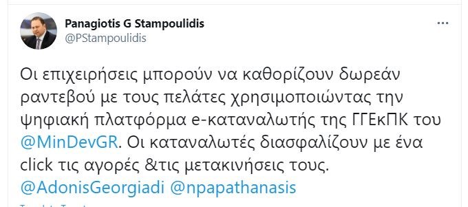 Δωρεάν μπορούν να καθορίζουν τα ραντεβού με τους πελάτες τους οι επιχειρήσεις, χρησιμοποιώντας την ψηφιακή πλατφόρμα e-καταναλωτής. Αυτό υπενθυμίζει με ανάρτησή του στα μέσα κοινωνικής δικτύωσης ο γενικός γραμματέας Εμπορίου και Προστασίας Καταναλωτή Παναγιώτης Σταμπουλίδης. Όπως σημειώνει ο γενικός γραμματέας: «Οι επιχειρήσεις μπορούν να καθορίζουν δωρεάν ραντεβού με τους πελάτες χρησιμοποιώντας την ψηφιακή πλατφόρμα e-καταναλωτής της γενικής γραμματείας Εμπορίου και Προστασίας Καταναλωτή του υπουργείου Ανάπτυξης και Επενδύσεων. Οι καταναλωτές διασφαλίζουν με ένα κλικ τις αγορές και τις μετακινήσεις τους».