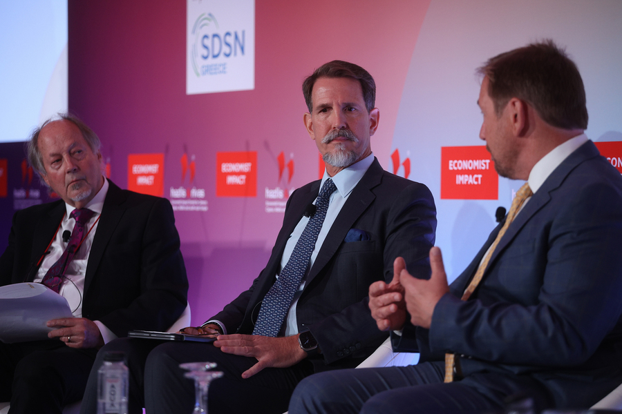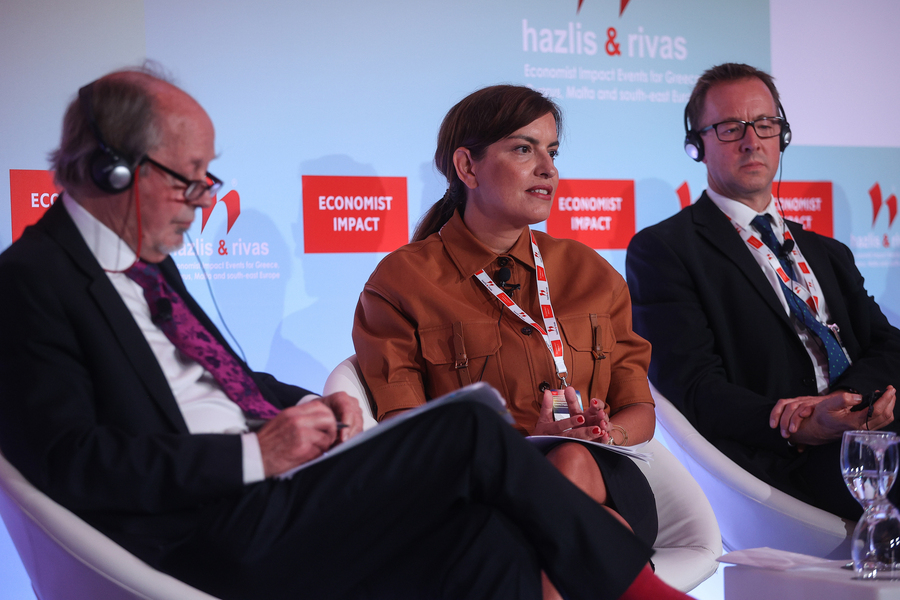 Ο John Andrews (Α), σύμβουλος έκδοσης του Economist, Ράνια Αικατερινάρη (Κ) αντιπρόεδρος ΣΕΒ και ο Chris Barton (Δ) CMG, συμμετέχουν σε πάνελ, στην 8η Σύνοδο Αειφορίας για τη ΝΑ Ευρώπη και τη Μεσόγειο του Economist με θέμα: «Επανεφεύρεση της πράσινης ηγεσίας: Συλλογικότητα έναντι κατακερματισμού;», στο Καβούρι, Δευτέρα 14 Οκτωβρίου 2024. ΑΠΕ-ΜΠΕ/ECONOMIST IMPACT/ΒΑΣΙΛΗΣ ΡΕΜΠΑΠΗΣ