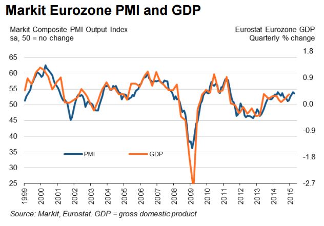«Απογοητεύει ο πιο αδύναμος ρυθμός της ανάπτυξης, δεδομένων των προσδοκιών ότι η ποσοτική χαλάρωση της ΕΚΤ (QE) θα μπορούσε να ενισχύσει την ανάκαμψη», σχολίασε ο Κρις Γουίλιαμσον, επικεφαλής οικονομολόγος της Markit, ανακοινώνοντας πως η ευρω-οικονομία διολισθαίνει από τα υψηλά 11 μηνών του Μαρτίου, σύμφωνα με τα προκαταρκτικά στοιχεία των δεικτών PMI (βιομηχανία και υπηρεσίες).