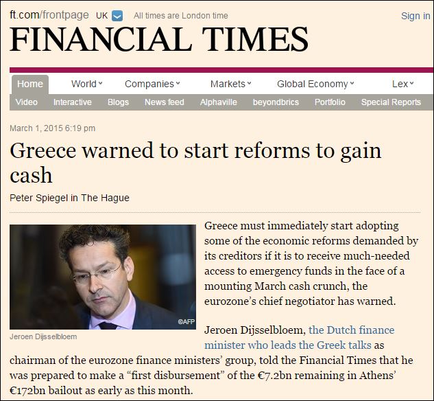 Μήνυμα στην Ελλάδα να ξεκινήσει αμέσως να υιοθετεί κάποιες από τις οικονομικές μεταρρυθμίσεις που απαιτούνται από τους πιστωτές της προκειμένου να λάβει μέρος της δόσης των 7,2 δισ ευρώ, στέλνει ο Γερούν Ντάισελμπλουμ με συνέντευξή του στους Financial Times.