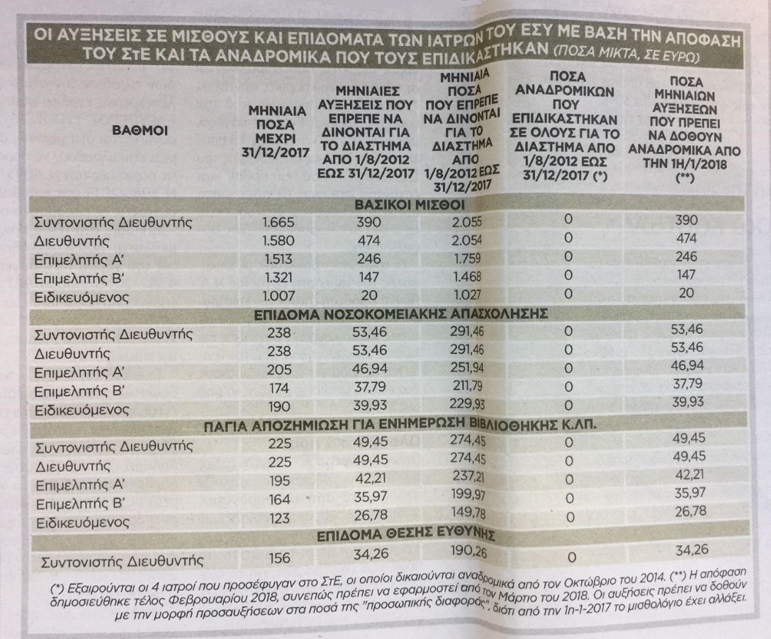 Για τους γιατρούς του ΕΣΥ τα πράγματα είναι πολύ χειρότερα. Οι εν λόγω λειτουργοί του Δημοσίου δεν δικαιούνται καθόλου αναδρομικά αλλά μόνο μηνιαίες αυξήσεις από τον τρέχοντα μήνα. Κι αυτό διότι η απόφαση του ΣτΕ προβλέπει ότι η αποκατάσταση των αποδοχών στα επίπεδα προ των περικοπών του ν. 4093/2012 πρέπει να γίνουν για όλους τους ιατρούς του ΕΣΥ μετά την 26η Φεβρουαρίου 2018, που είναι η ημερομηνία δημοσίευσης της συγκεκριμένης απόφασης. Οι μόνοι που δικαιούνται αναδρομικά είναι οι 4 ιατροί που προσέφυγαν στο ΣτΕ. Αλλά και αυτών τα αναδρομικά προβλέπεται να είναι «κουρεμένα» καθώς μετρούν από τον Οκτώβριο του 2014.