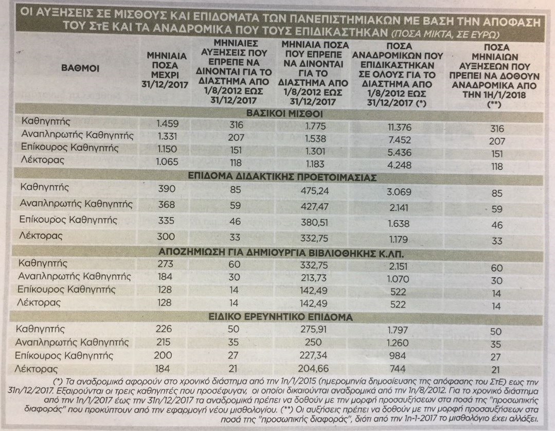 Τα μέλη του Διδακτικού και Ερευνητικού Προσωπικού των Ανωτάτων Εκπαιδευτικών Ιδρυμάτων δεν δικαιούνται αποκατάστασης των αποδοχών τους από την 1η-8-2012. Δεν μπορούν δηλαδή να λάβουν τα ποσά των αποδοχών που έχασαν αναδρομικά από την 1η-8-2012, δηλαδή με ημερομηνία που τέθηκαν σε ισχύ οι περικοπές του ν. 4093/2012 στους βασικούς μισθούς και τα επιδόματά τους αλλά από την 1η Ιανουαρίου του 2015 με την οποία έγινε και δεκτή η προσφυγή τριών καθηγητών κατά των περικοπών του ν. 4093/2012. Μόνο οι τρεις καθηγητές που προσέφυγαν δικαιούνται πλήρως αποκατάστασης των αποδοχών τους, δηλαδή αναδρομικά από την 1η-8-2012!