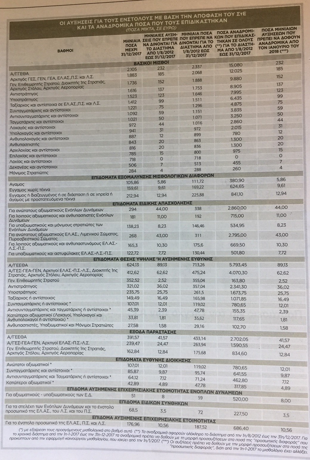 Οι στρατιωτικοί, οι αστυνομικοί, οι λιμενικοί και οι πυροσβέστες δικαιώθηκαν πλήρως και έχουν ήδη λάβει σε μηνιαίες δόσεις τα αναδρομικά που αντιστοιχούν στο 50% των περικοπών που επιβλήθηκαν από την 1η-8-2012 με το νόμο 4093/2013. Επιπλέον το Δημόσιο οφείλει να καταβάλει ακαθάριστα ποσά αναδρομικών από 643,60 ευρώ έως 27.902,55 ευρώ τα οποία αντιστοιχούν στο υπόλοιπο 50% των περικοπών σε βασικούς μισθούς και επιδόματα που τους επιβλήθηκαν την περίοδο από την 1η-8-2012 έως την 31η-12-2017 με το ν. 4093/2013. Παράλληλα δικαιούνται πλέον και προσαύξησης των «προσωπικών διαφορών» που λαμβάνουν κάθε μήνα από τον Ιανουάριο του τρέχοντος έτους κατά τα ακαθάριστα ποσά μηνιαίων αυξήσεων που προκύπτουν για την περίοδο από 1-8-2012 έως 31-12-2017 εξαιτίας της επιβεβλημένης πλήρους αποκατάστασης των αποδοχών τους στα επίπεδα του Ιουλίου του 2012.