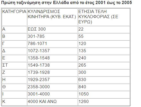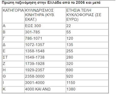 Επιβατικά αυτοκίνητα ταξινομούμενα για πρώτη φορά την Ελλάδα από 1.11.2010 και μετά, αποκλειστικά με βάση τις εκπομπές διοξειδίου του άνθρακα (γραμμάρια C02 ανα χιλιόμετρο). Λαμβάνονται υπόψιν οι εκπομπές διοξειδίου του άνθρακα όπως αυτές αναγράφονται στην άδεια του οχήματος ως εξής: