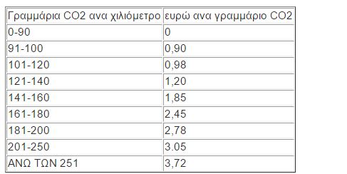 Επιβατικά αυτοκίνητα ταξινομούμενα για πρώτη φορά την Ελλάδα από 1.11.2010 και μετά, αποκλειστικά με βάση τις εκπομπές διοξειδίου του άνθρακα (γραμμάρια C02 ανα χιλιόμετρο). Λαμβάνονται υπόψιν οι εκπομπές διοξειδίου του άνθρακα όπως αυτές αναγράφονται στην άδεια του οχήματος ως εξής: