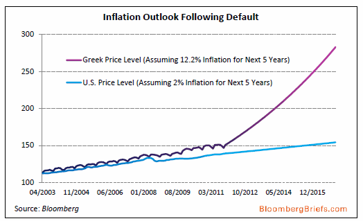 Τις προβλέψεις για τον πληθωρισμό της Ελλάδας σε περίπτωση της χρεοκοπίας παρουσίασε το πρακτορείο Bloomberg. Σύμφωνα με το γράφημα, ο πληθωρισμός της χώρας μας θα αυξάνεται με ρυθμό 12.2% για τα επόμενα πέντε χρόνια σε περίπτωση χρεοκοπίας…