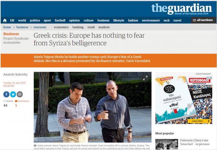 Ο Αλέξης Τσίπρας νομίζει ότι κατέχει ένα ακόμα ατού: τον φόβο της Ευρώπης για μια ελληνική χρεοκοπία αναφέρει σε ανάλυση του οικονομολόγου Ανατόλ Καλέτσκι που φιλοξενεί ο Guardian υπογραμμίζοντας ωστόσο ότι αυτό είναι μια αυταπάτη που προωθείται από τον υπουργό Οικονομικών, Γιάνη Βαρουφάκη.