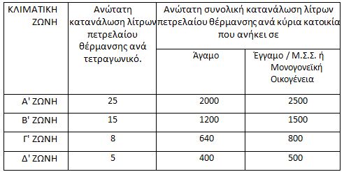 3. Για κάθε κατοικία, ανεξαρτήτως ζώνης, χορηγείται επίδομα σε άγαμους για τα πρώτα 80 τετραγωνικά μέτρα και για τα πρώτα 100 μέτρα για τους έγγαμους και τις μονογονεϊκές οικογένειες, με ανώτατη κατανάλωση πετρελαίου θέρμανσης ανά κλιματική ζώνη και ανά τετραγωνικό ως ακολούθως: