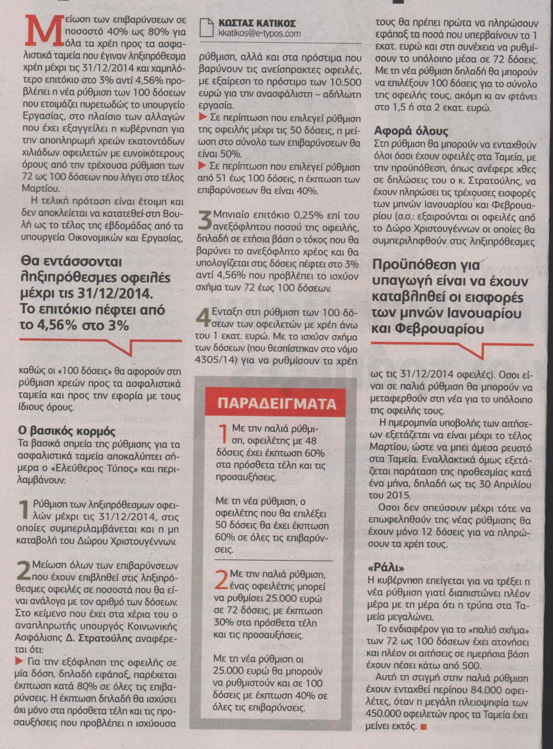 Μείωση των επιβαρύνσεων σε ποσοστό 40% ως 80% για όλα τα χρέη προς τα ασφαλιστικά ταμεία που έγιναν ληξιπρόθεσμα χρέη μέχρι τις 31/12/2014 και χαμηλότερο επιτόκιο στο 3% αντί 4,56% προβλέπει η νέα ρύθμιση των 100 δόσεων που ετοιμάζει πυρετωδώς το υπουργείο Εργασίας, στο πλαίσιο των αλλαγών που έχει εξαγγείλει η κυβέρνηση για την αποπληρωμή χρεών εκατοντάδων χιλιάδων οφειλετών με ευνοϊκότερους όρους από την τρέχουσα ρύθμιση των 72 ως 100 δόσεων που λήγει στο τέλος Μαρτίου.
