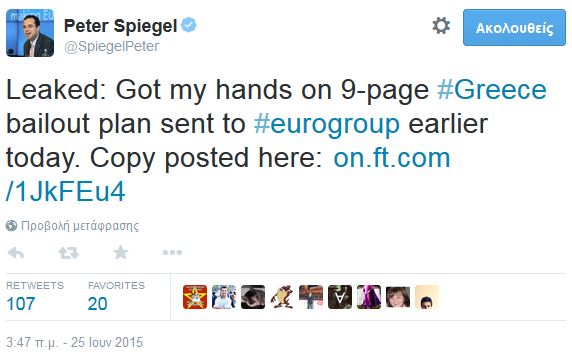 «Έχω στα χέρια μου το 9-σέλιδο σχέδιο διάσωσης της Ελλάδας που στάλθηκε στο Εurogroup νωρίτερα», γράφει το tweet.