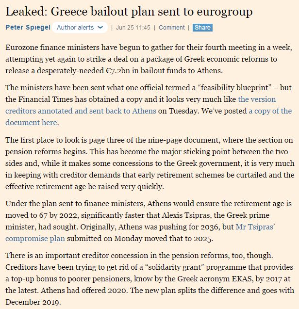 Το μεγαλύτερο ενδιαφέρον είναι στην τρίτη σελίδα για το συνταξιοδοτικό, γράφει ο δημοσιογράφος των FT, διατηρεί τις απαιτήσεις των δανειστών για περικοπή των πρόωρων συντάξεων και την γρήγορη αύξηση των ορίων ηλικίας.