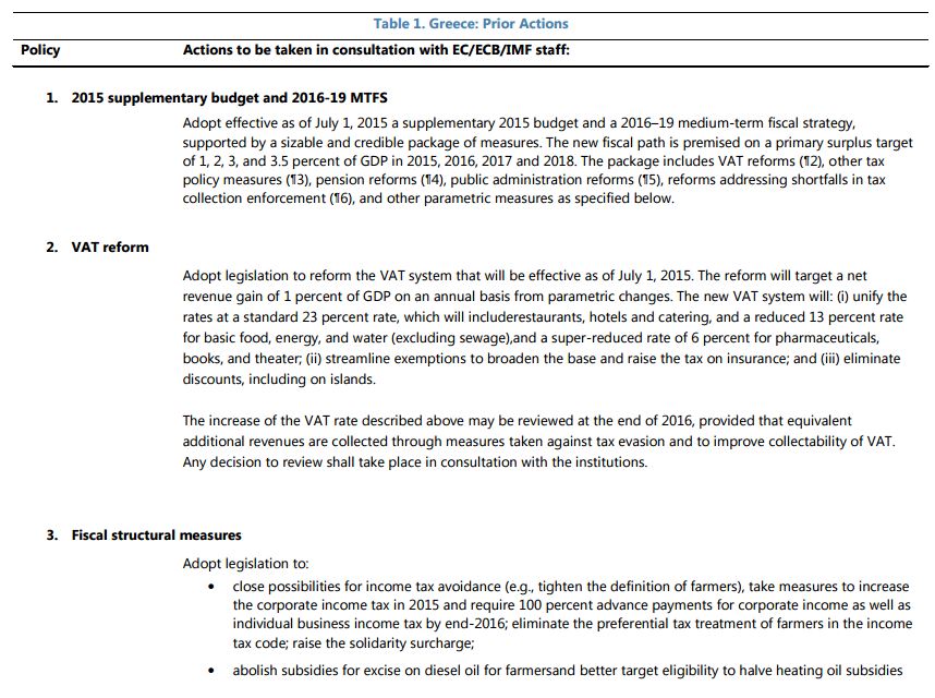 Σύμφωνα με τις πρώτες πληροφορίες, εστίαση και τουρισμός στο 23% ΦΠΑ από τον Ιούλιο του 2015, στο 13% βασικά τρόφιμα ενέργεια και νερό, αύξηση στο φόρο των επιχειρήσεων στο 28% από 26%, έναντι 29% που ήθελε η Αθήνα.