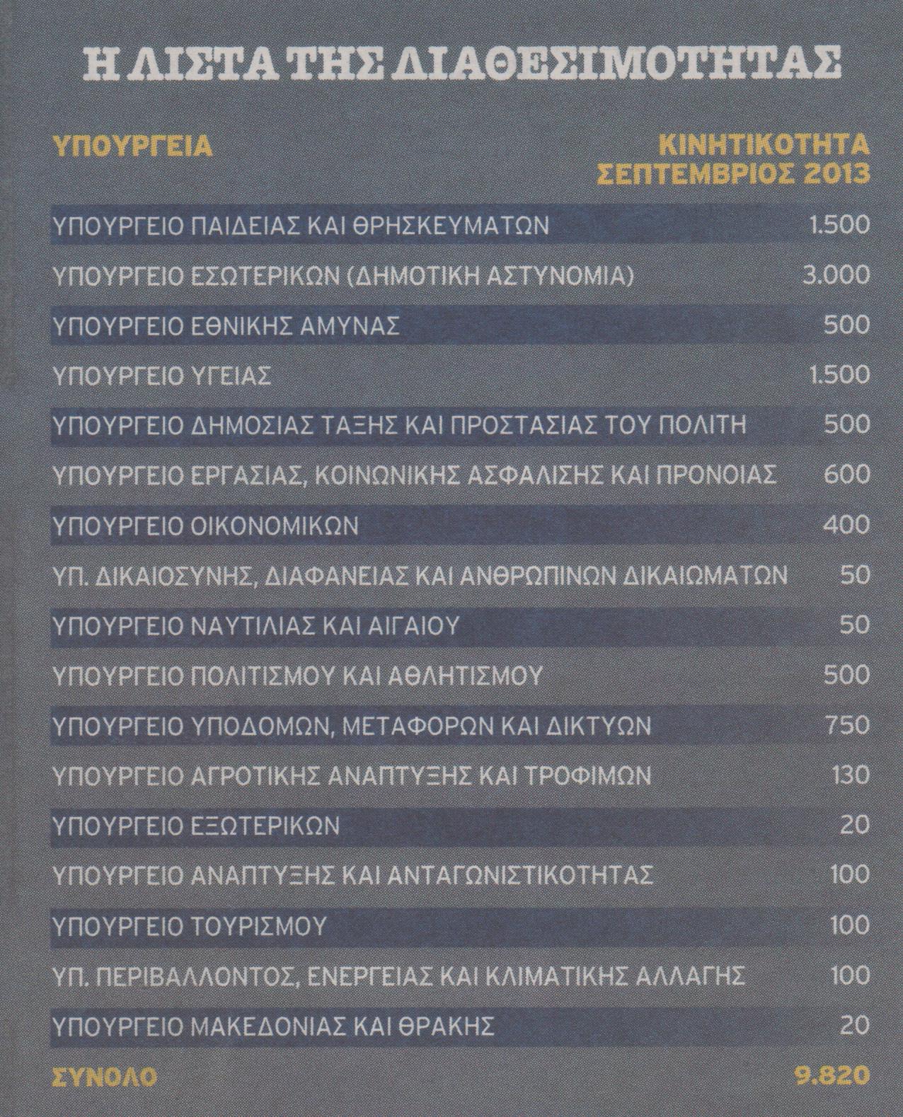 Αξίζει να σημειωθεί ότι έχουν τεθεί σε διαθεσιμότητα με την ψήφιση του πολυνόμου του υπουργείου Οικονομικών 4.260 υπάλληλοι και απομένουν ακόμη 8.296 που πρέπει να τεθούν σε καθεστώς κινητικότητας μέχρι τον Σεπτέμβριο. Για τον λόγο αυτό η κυβέρνηση έθεσε ως στόχο να τεθούν σε διαθεσιμότητα 9.820 υπάλληλοι, δηλαδή 1524 περισσότεροι από όσους προβλέπει η μνημονιακή δέσμευση, προκειμένου ν’ αντιμετωπιστούν τυχόν δυσλειτουργίες και καθυστερήσεις.