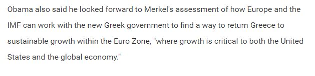 Όπως αναφέρεται στο τηλεγράφημα, ο πρόεδρος των ΗΠΑ προσβλέπει στην αξιολόγηση της Καγκελάριου της Γερμανίας, Άνγκελα Μέρκελ για το πώς θα μπορέσουν η Ευρώπη και το Διεθνές Νομισματικό Ταμείο να συνεργαστούν με την ελληνική κυβέρνηση, ούτως ώστε να βρεθεί τρόπος να επιστρέψει η Ελλάδα στη βιώσιμη ανάπτυξη εντός ευρώ, όπου είναι ζωτικής σημασίας τόσο για τις ΗΠΑ όσο και για την παγκόσμια οικονομία.