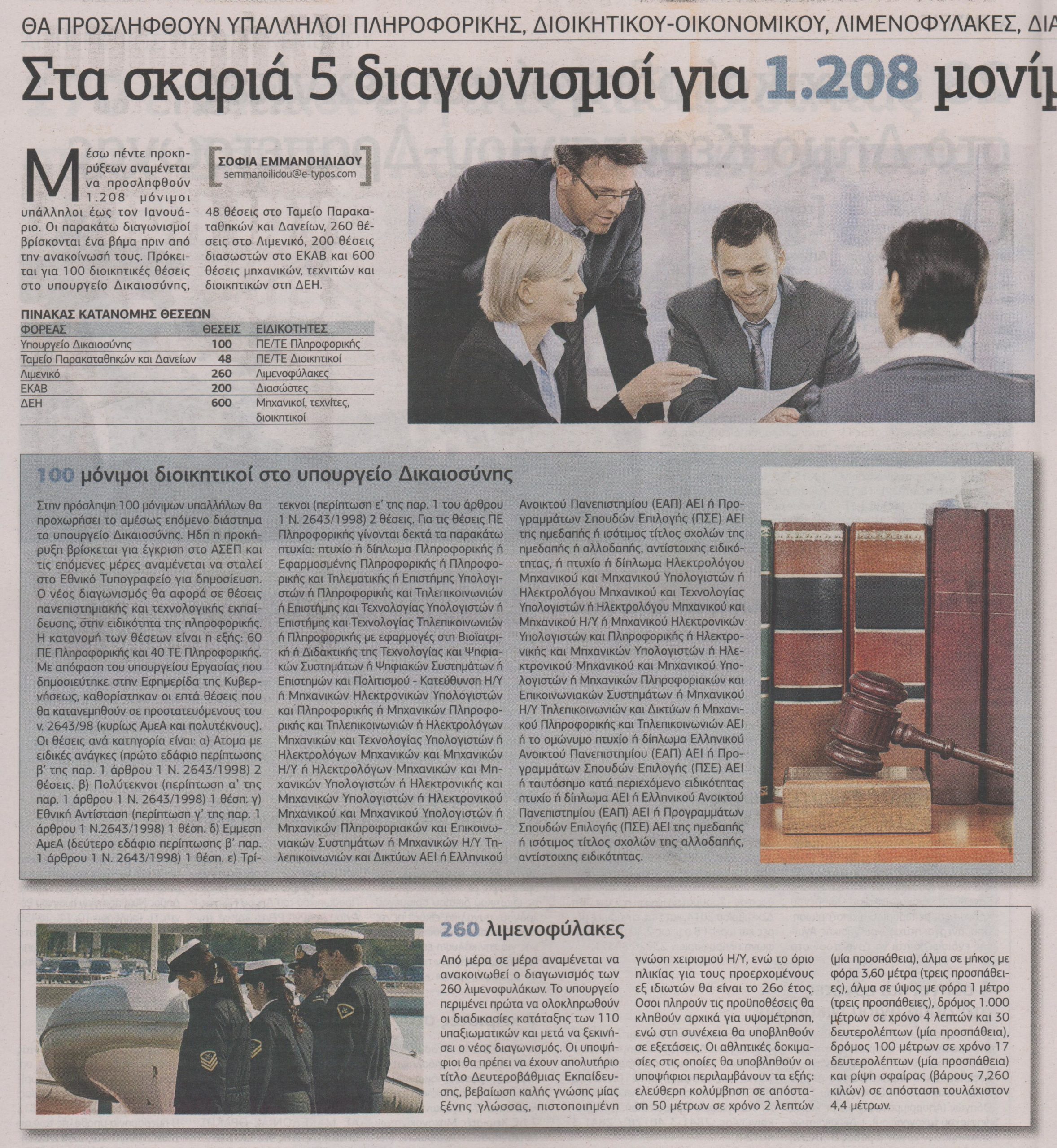 Μέσω πέντε προκηρύξεων αναμένεται να προσληφθούν 1.208 μόνιμοι υπάλληλοι έως τον Ιανουάριο.