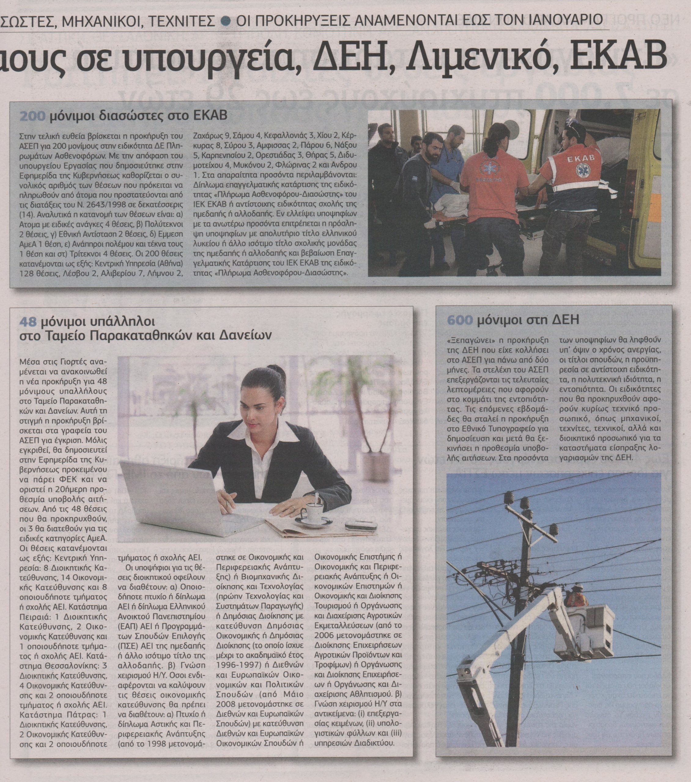 Πρόκειται για 100 διοικητικές θέσεις στο υπουργείο Δικαιοσύνης, 48 θέσεις στο Ταμείο Παρακαταθηκών και Δανείων, 260 θέσεις στο Λιμενικό, 200 θέσεις στο ΕΚΑΒ και 600 θέσεις μηχανικών, τεχνιτών και διοικητικών στη ΔΕΗ.