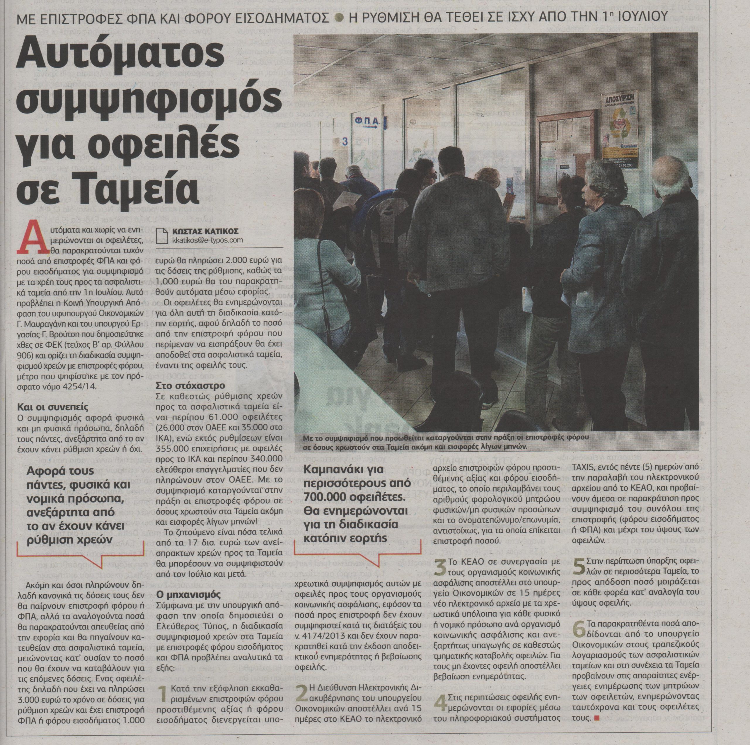 Αυτόματος συμψηφισμός για οφειλές σε Ταμεία
