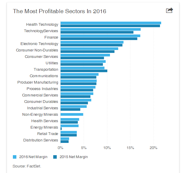 Σύμφωνα με τα στοιχεία που συγκέντρωσε ο κλάδος της ιατρικής τεχνολογίας αναμένεται να έχει φέτος περιθώριο κέρδους 21,6%. Γενικότερα, ο κλάδος της τεχνολογίας θα έχει περιθώριο κέρδους 17,2% ενώ τα χρηματοοικονομικά 17,1%.