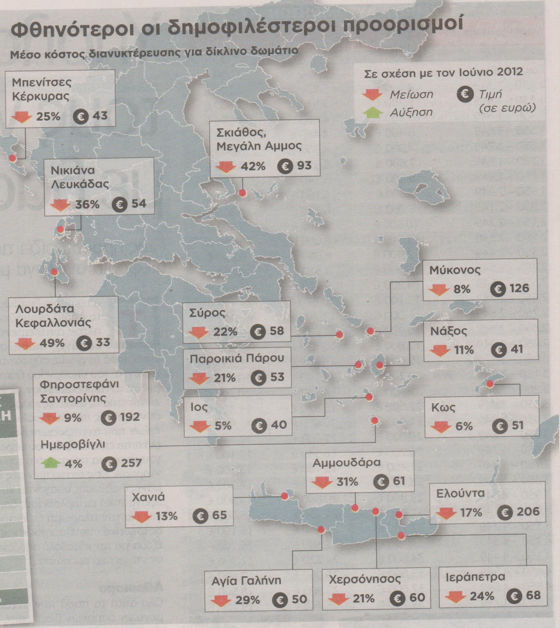 Φθηνότερες έως και κατά 49% διακοπές για όλους προσφέρουν φέτος οι ελληνικοί τουριστικοί προορισμοί. Οι συγκρίσεις των περσινών τιμών με τις φετινές δείχνουν ότι η «ελεύθερη πτώση» των ξενοδοχειακών τιμών συνεχίζεται.