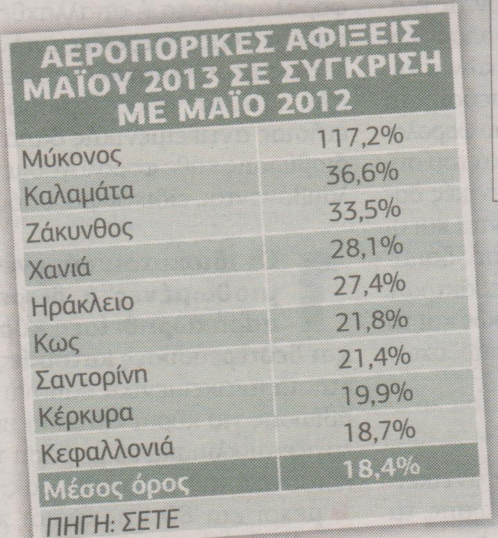 Την ίδια ώρα οι αφίξεις των αεροπλάνων στα αεροδρόμια της χώρας παρουσιάζουν ραγδαία αύξηση. Πρωταθλήτρια αναδεικνύεται η Μύκονος με αύξηση 117,2% ενώ ακολουθεί η Καλαμάτα με 36,6%.