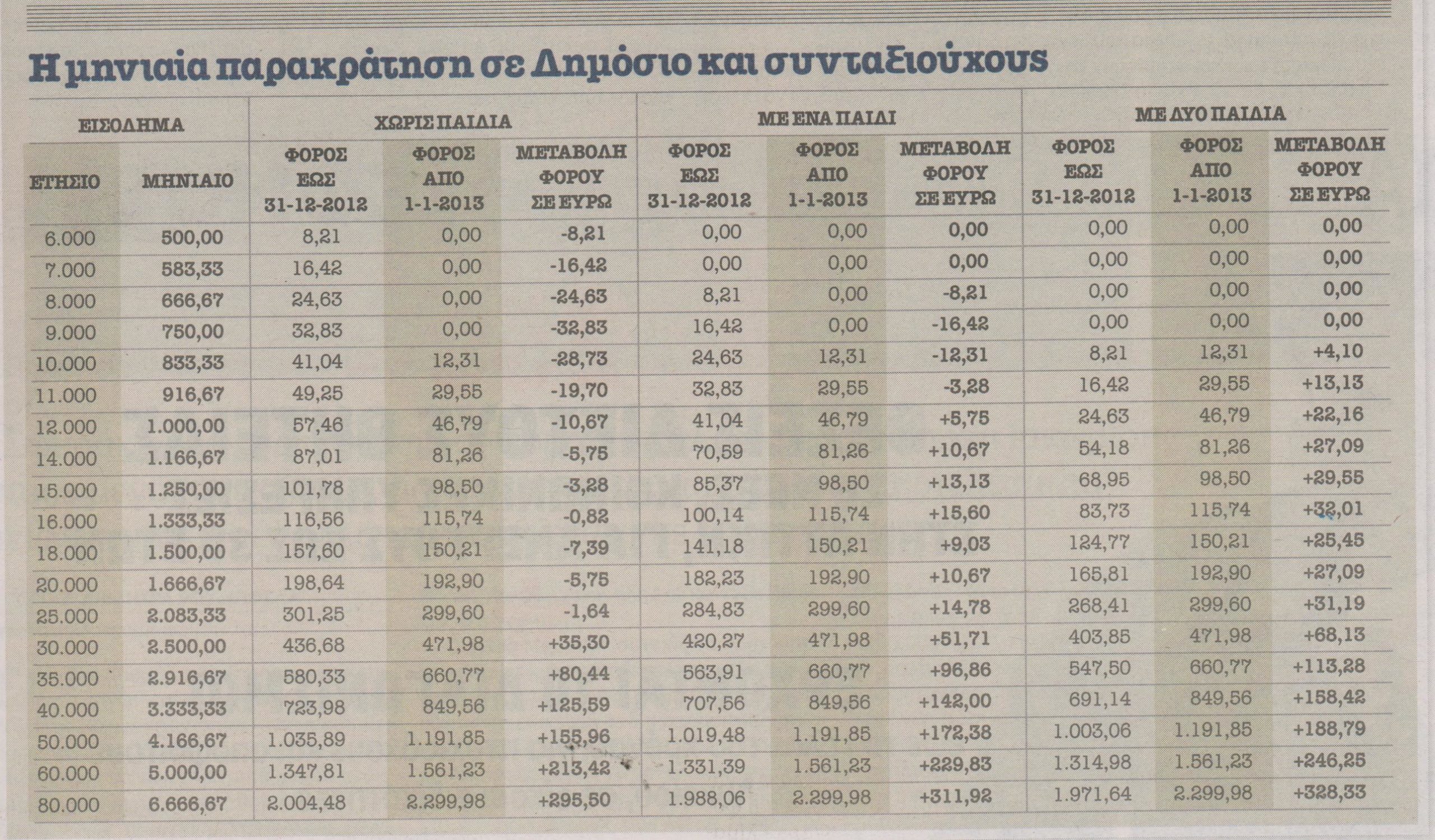 Σε αύξηση της παρακράτησης φόρου που σε ορισμένες περιπτώσεις φτάνει και το 90%, οδηγεί το νέο καθεστώς σε μισθούς και συντάξεις. Οι πρόσθετες μηνιαίες απώλειες κυμαίνονται από 13 έως 136 ευρώ για όσους έχουν ένα ή δύο παιδιά και οι αποδοχές τους κυμαίνονται από 916 έως και 2.917 ευρώ το μήνα. Σε κάποιες περιπτώσεις (μισθωτός με δύο παιδιά και ετήσιο εισόδημα 12.000) η αύξηση της παρακράτησης φτάνει και το 90%.