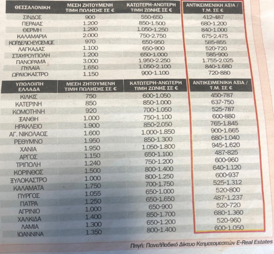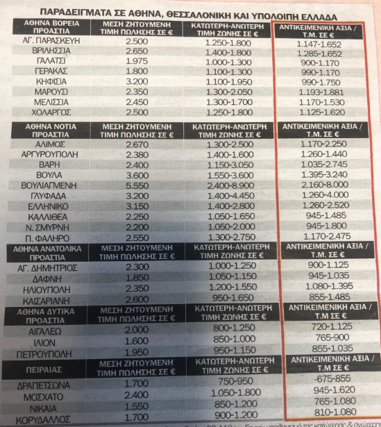 Προς επίρρωση, όπως προκύπτει από τα στοιχεία του πανελλαδικού δικτύου E-Real Estates, η μέση ζητούμενη τιμή πώλησης ενός διαμερίσματος πρώτου ορόφου, πενταετίας, 90-110 τ.μ., στον Άγιο Δημήτριο υπολογίζεται στις 2.300 ευρώ/τ.μ., όταν η αντικειμενική του αξία κυμαίνεται μεταξύ 900-1.125 ευρώ/τ.μ.