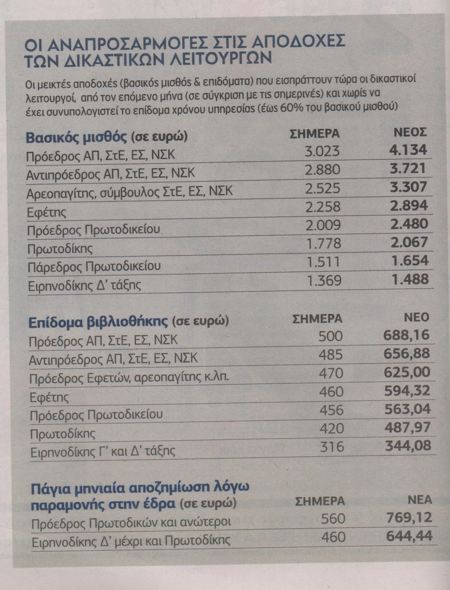 Με τις αυξήσεις που θα πάρουν οι δικαστικοί λειτουργοί από τον ερχόμενο μήνα (επανερχόμενοι στους μισθούς του Ιουλίου 2012) ο κρατικός προϋπολογισμός θα επιβαρυνθεί ετησίως κατά 70 εκατ. ευρώ (σύμφωνα με εκτιμήσεις του Γενικού Λογιστηρίου του Κράτους), ενώ, όταν εγκριθούν και τα αναδρομικά τους για την τελευταία διετία, (τη σχετική υπουργική απόφαση αναμένεται να συνυπογράψει και ο συναρμόδιος υπουργός Οικονομικών), θα υπάρξει μία επιπλέον επιβάρυνση ύψους 100 εκατ. ευρώ.