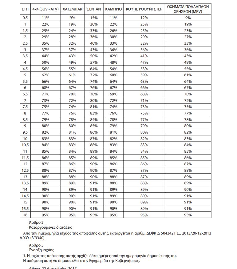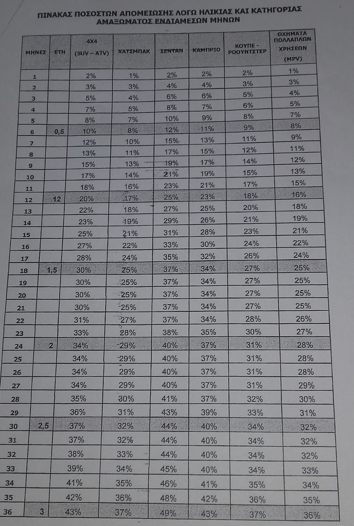 Οι νέοι συντελεστές απομείωσης λόγω ηλικίας, αμαξώματος και διανυθέντων χιλιομέτρων που θα ισχύσουν από το 2018: