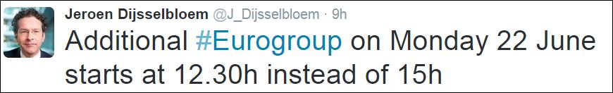 Σύμφωνα με τον πρόεδρο του Eurogroup η συνεδρίαση θα αρχίσει στις 13:30 (ώρα Ελλάδας) αντί για τις 16:00.