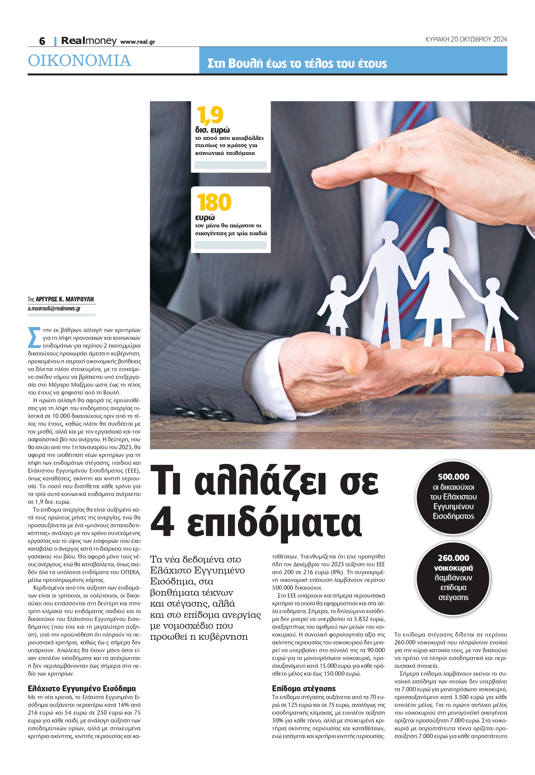 Με τη νέα χρονιά, το Ελάχιστο Εγγυημένο Εισόδημα αυξάνεται περαιτέρω κατά 16% από 216 ευρώ και 54 ευρώ σε 250 ευρώ και 75 ευρώ για κάθε παιδί, με ανάλογη αύξηση των εισοδηματικών ορίων, αλλά με στοχευμένα κριτήρια ακίνητης, κινητής περιουσίας και καταθέσεων. Υπενθυμίζεται ότι είχε προηγηθεί ήδη τον Δεκέμβριο του 2023 αύξηση του ΕΕΕ από 200 σε 216 ευρώ (8%). Τη συγκεκριμένη οικονομική ενίσχυση λαμβάνουν περίπου 500.000 δικαιούχοι.