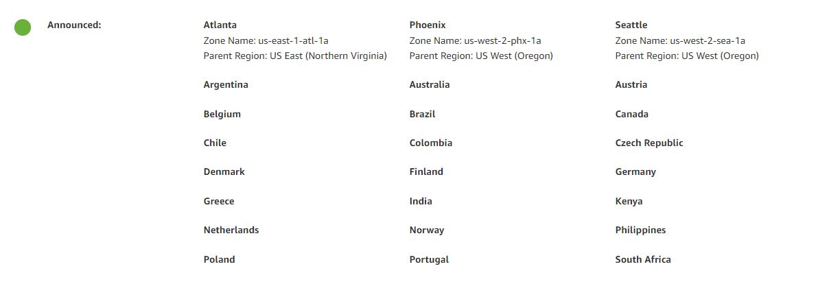 «Θα εγκαινιάσουμε περισσότερες από 30 νέες Τοπικές Ζώνες AWS σε μεγάλες πόλεις σε όλο τον κόσμο. Αυτές οι νέες Τοπικές ζώνες AWS θα είναι διαθέσιμες από το 2022 σε περισσότερες από 21 χώρες, όπως η Αργεντινή, η Αυστραλία, η Αυστρία, το Βέλγιο, η Βραζιλία, ο Καναδάς, η Χιλή, η Κολομβία, η Τσεχία, η Δανία, η Φινλανδία, η Γερμανία, η Ελλάδα, η Ινδία, η Κένυα, η Ολλανδία, η Νορβηγία, οι Φιλιππίνες, η Πολωνία, η Πορτογαλία και η Νότια Αφρική, και θα συνδεθούν με 16 Τοπικές Ζώνες σε όλες τις ΗΠΑ, βοηθώντας σας να εξυπηρετείτε τους τελικούς χρήστες σε όλο τον κόσμο με ακόμη μικρότερη χρονική καθυστέρηση».
