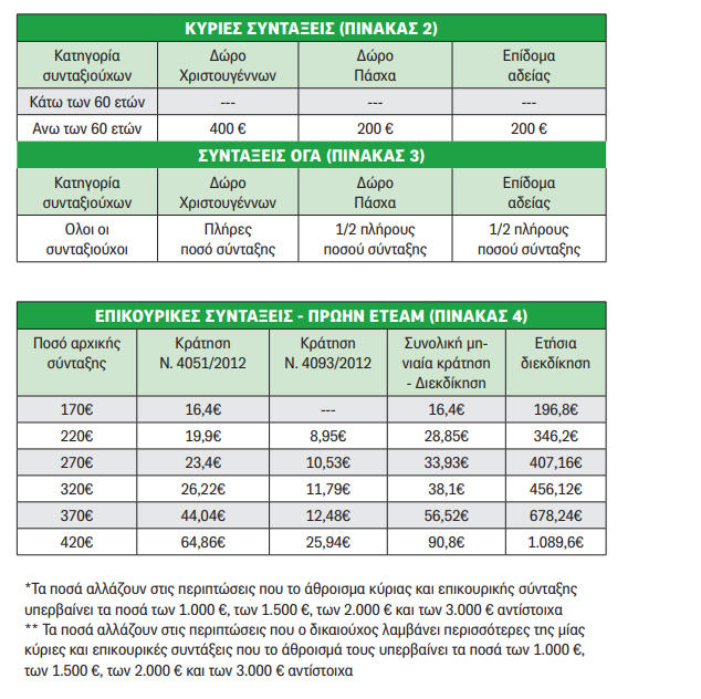 γ) Για συντάξεις από 300 ευρώ και άνω ποσοστό µείωσης 20%. Με τις επίµαχες διατάξεις του 2012 οι συνταξιούχοι έχασαν και τα πλήρη δώρα Χριστουγέννων, Πάσχα και αδείας στην επικουρική τους.