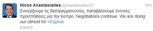 Ο πρόεδρος της Κύπρου Νίκος Αναστασιάδης, με ένα tweet του, πριν από λίγα λεπτά, ενημέρωσε ότι συνεχίζονται οι διαπραγματεύσεις.