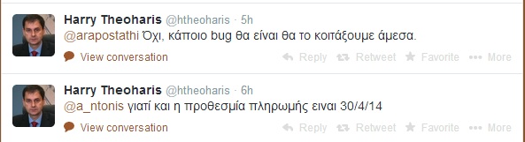 «Είναι κάποιο bug και θα το κοιτάξουμε άμεσα» έγραψε στο twitter ο γενικός γραμματέας εσόδων Χάρης Θεοχάρης και επεσήμανε ότι δεν υπάρχει παράταση στην προθεσμία υποβολής των δηλώσεων.