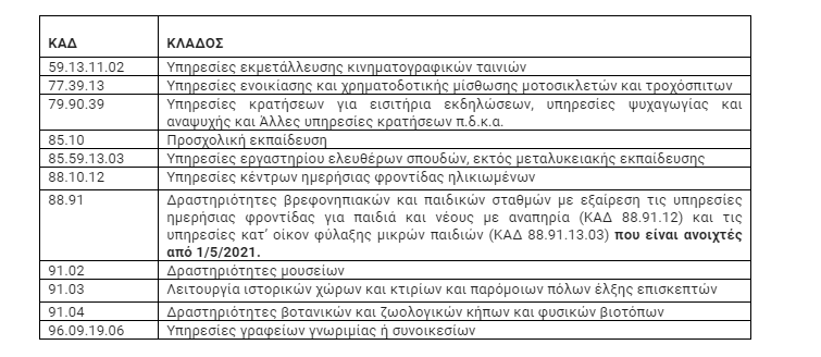 Δυνατότητα υποβολής δηλώσεων αναστολής συμβάσεων εργασίας των εργαζομένων τους με έναρξη από 14/5/2021 θα έχουν οι επιχειρήσεις – εργοδότες σε όλη τη χώρα, που επαναλειτουργούν από 14/5/2021 και πλήττονται και των οποίων η δραστηριότητα είχε ανασταλεί το μήνα Μάιο και περιλαμβάνεται στους ΚΑΔ του παρακάτω πίνακα. Οι υποβολές μπορούν να πραγματοποιούνται από σήμερα Τρίτη 18/5/2021 έως 20/5/2021.