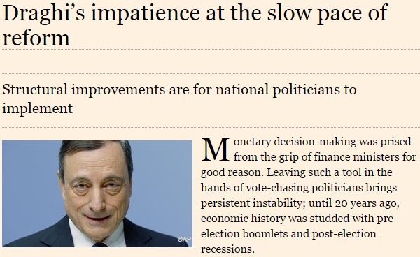 Η τελευταία παρέμβαση του επικεφαλής της ΕΚΤ, Μάριο Ντράγκι, προς τις ευρωπαϊκές κυβερνήσεις να δεσμευτούν σε νέες διαρθρωτικές μεταρρυθμίσεις, προδίδει τόσο μεγάλη ανυπομονησία που κινδυνεύει να υπερβεί το όριο το οποίο διαχωρίζει τα καθήκοντά του από αυτά των δημοκρατικά εκλεγμένων πολιτικών, αναλύει σχόλιο στην εφημερίδα Financial Times.