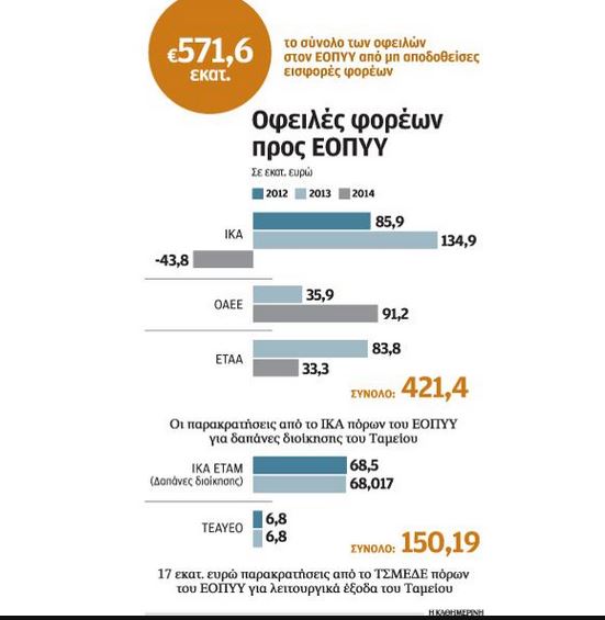 Ειδικότερα, το ΙΚΑ οφείλει από εισφορές ασφαλισμένων του 2012 και του 2013 το ποσό των 177,066 εκατομμυρίων ευρώ (για το 2014, το ΙΚΑ έχει αποδώσει τις μέχρι τώρα εισφορές, ενώ έχει «καλύψει» και μέρος των οφειλουμένων από τα προηγούμενα έτη), ο ΟΑΕΕ από εισφορές του 2013 και του 2014 το ποσό των 127,2 εκατομμυρίων και το ΕΤΑΑ για τα ίδια έτη 117,2 εκατ. ευρώ.
