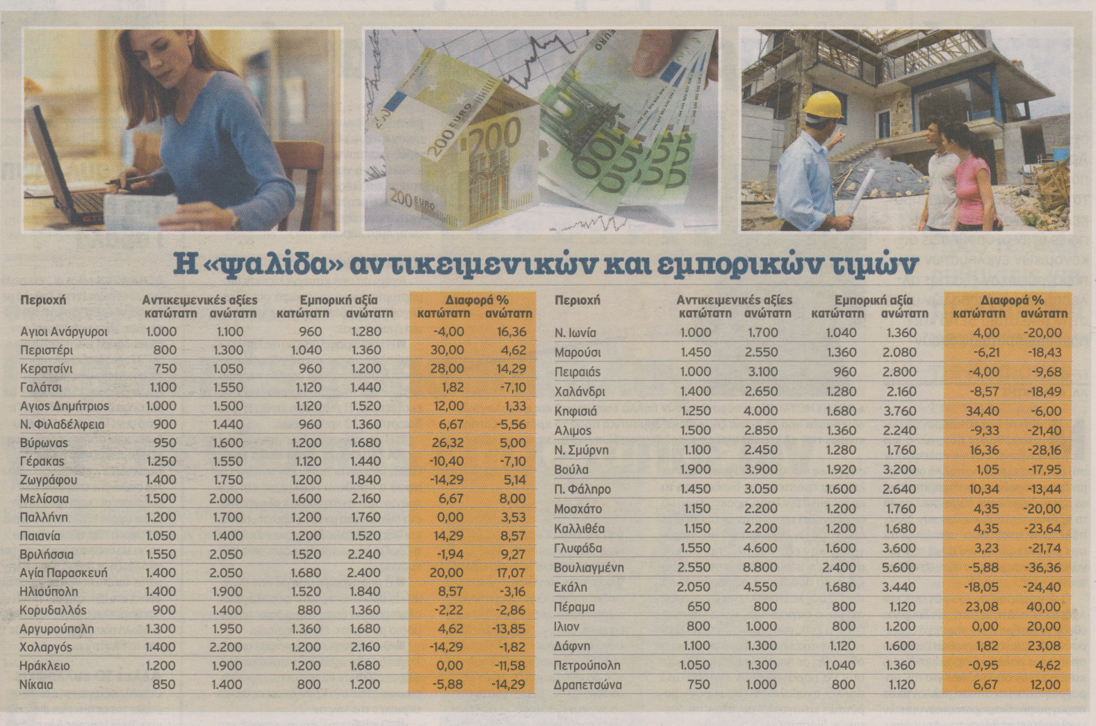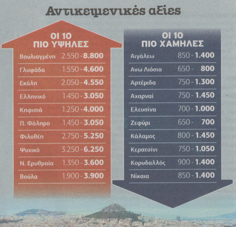 Μείωση 20%-40% στις τιμές ζώνης ακριβών περιοχών όπως η Γλυφάδα, η Εκάλη, η Κηφισιά, η Φιλοθέη. Εκεί οι αντικειμενικές είναι σημαντικά υψηλότερες από τις ισχύουσες εμπορικές. Για παράδειγμα, υπάρχουν σπίτια που φορολογούνται με αντικειμενική 8.800 ευρώ το τ.μ. αλλά δεν πωλούνται πάνω από 6.000 ευρώ το τ.μ.