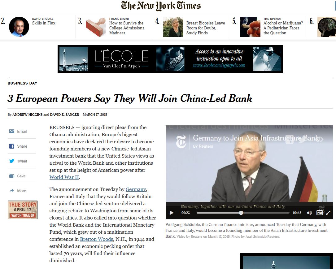 Η Γερμανία, η Γαλλία και η Ιταλία πρόκειται να συμμετάσχουν ως ιδρυτικά μέλη στην κινεζικής επιρροής αναπτυξιακή τράπεζα, Asian Infrastructure Investment Bank (AIIB), προκαλώντας εκνευρισμό στις ΗΠΑ . Η Γερμανία θα συνεισφέρει, δήλωσε ο Β. Σόιμπλε.