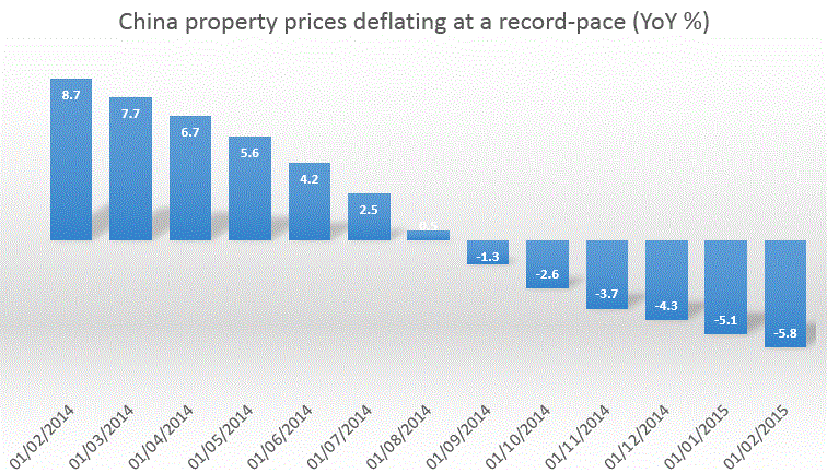 Η κινέζικη οικονομία «φρενάρει» τα τελευταία χρόνια, όπως αντικατοπτρίζεται κι από τις τιμές των νέων ακινήτων που υποχωρούν σημαντικά. Το Φεβρουάριο βούτηξαν 5,8% σε ετήσια βάση, από υποχώρηση 5,1% που είχαν σημειώσει τον Ιανουάριο.