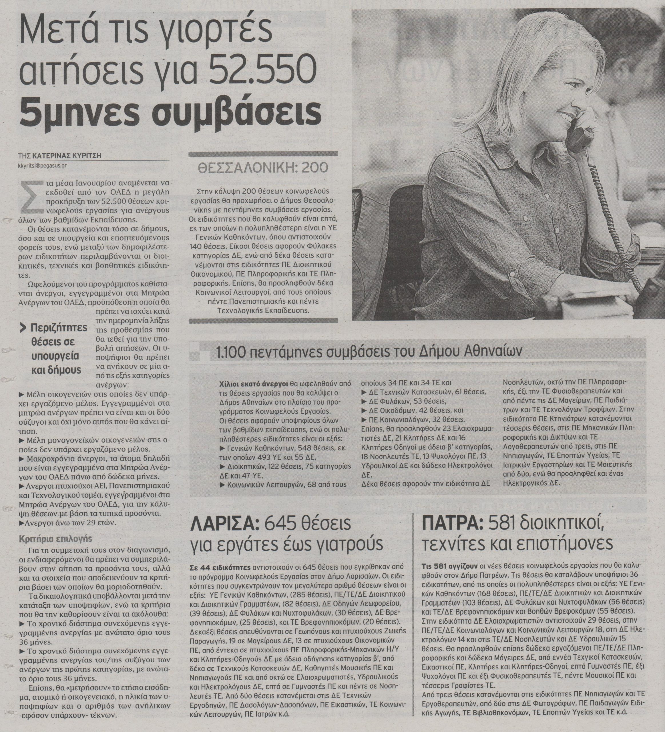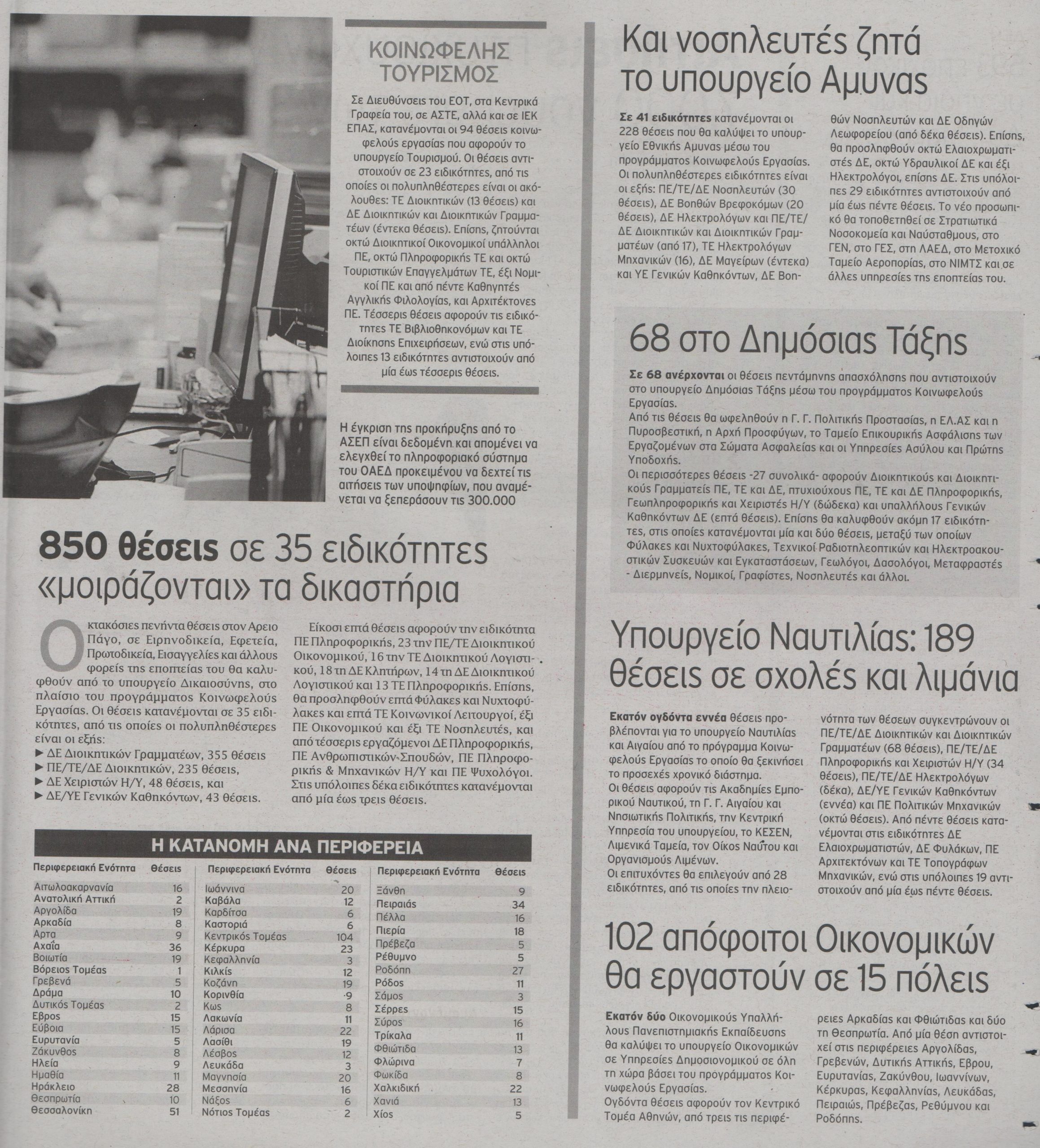 Το ΑΣΕΠ έχει προχωρήσει στον έλεγχο της προκήρυξης και ο ΟΑΕΔ αναμένει το «πράσινο φως» για να απευθύνει τη σχετική πρόσκληση. Το «Εθνος-Εργασία» ξεχωρίζει σήμερα τις ειδικότητες που θα έχουν ζήτηση στους Δήμους Αθηναίων, Θεσσαλονίκης, Λάρισας και Πάτρας, στα δικαστήρια και τα υπουργεία Εθνικής Αμυνας, Δημόσιας Τάξης, Ναυτιλίας, Οικονομικών και Τουρισμού.