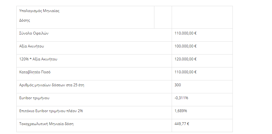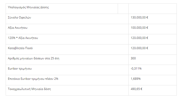 Ό αιτών καταβάλλει το 120% της αξίας της κύριας κατοικίας του σε μηνιαίες ισόποσες τοκοχρεωλυτικές δόσεις, με επιτόκιο ίσο με το Euribor τριμήνου προσαυξημένο κατά 2%.