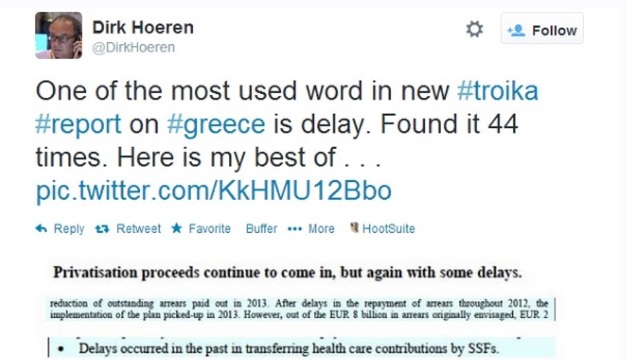 Σε ένα μάλλον ειρωνικό σχόλιο στο twitter, ο ανταποκριτής της γερμανικής εφημερίδας Bild στις Βρυξέλλες, Dirk Hoeren, επισημαίνει ότι η λέξη «καθυστέρηση» φαίνεται να είναι μία από τις πιο πολυχρησιμοποιημένες λέξεις στη νέα έκθεση της τρόικας για την Ελλάδα.