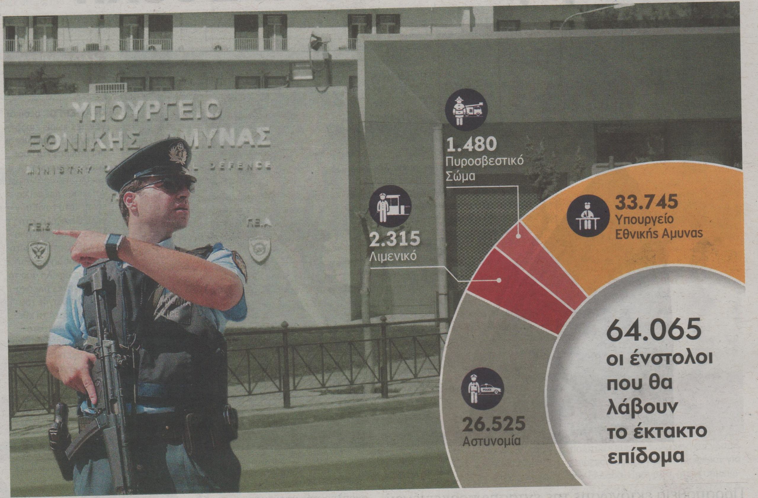 Εξάλλου, όπως έγινε γνωστό χθες, 64.065 ένστολοι με ακαθάριστες μηνιαίες αποδοχές κάτω των 1.500 ευρώ θα λάβουν εφάπαξ επίδομα στις 9 Μαΐου.