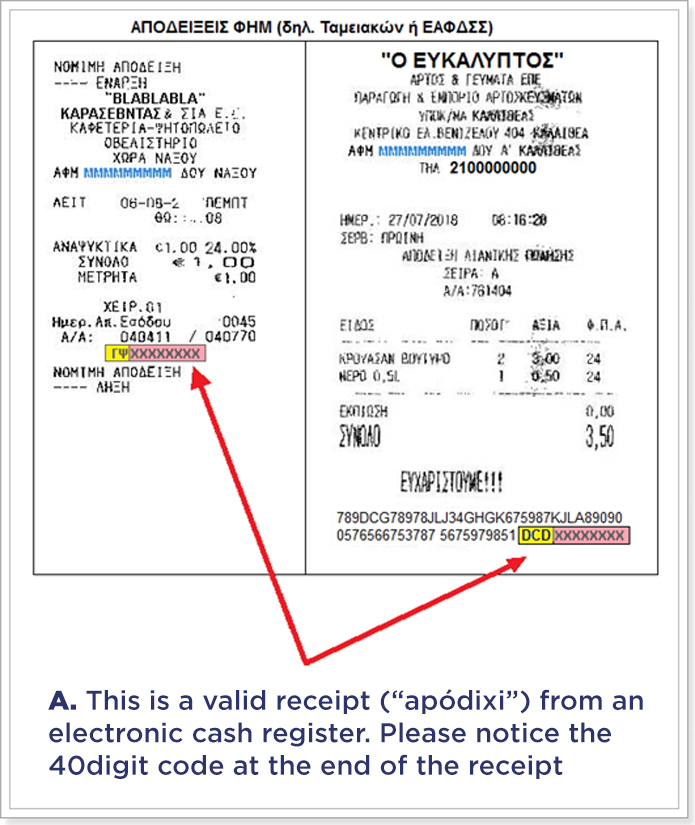 Επιπλέον, όλοι οι προμηθευτές αγαθών και υπηρεσιών υποχρεούνται να εκδίδουν αποδείξεις στους πελάτες τους. Ο καταναλωτής δεν είναι υποχρεωμένος να πληρώνει, σε μετρητά ή με κάρτα, εάν δεν του παρασχεθεί έγκυρη απόδειξη πληρωμής («apodixi»).