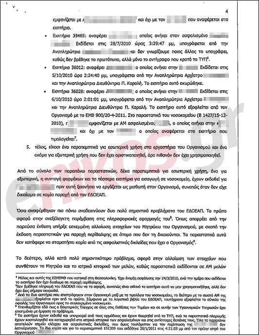 -«Το πρώτο αφορά στην ανεξέλεγκτη παρέμβαση στις πληροφοριακές εφαρμογές του. Όπως απορρέει από την παρούσα έκθεση υπήρξε εσκεμμένη αλλοίωση των στοιχείων του Μητρώου του Οργανισμού, με σκοπό την έκδοση παραστατικών για παροχή περίθαλψης σε άτομα που δεν τη δικαιούνται».