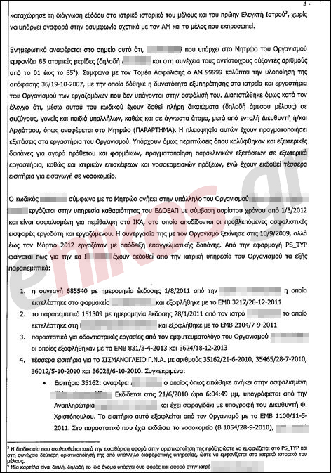 «Από το σύνολο των παραπάνω παραστατικών, δέκα παραπεμπτικά για εσωτερική χρήση, ένα για εξωτερική, η συνταγή φαρμάκων και τα τέσσερα εισιτήρια για εισαγωγή σε νοσοκομείο, έχουν εκδοθεί για την… πριν αυτή ξεκινήσει να εργάζεται ως μισθωτή στον Οργανισμό, συνεπώς όταν δεν είχε δικαίωμα σε καμία παροχή από τον ΕΔΟΕΑΠ» αναφέρεται στην έκθεση ελέγχου.