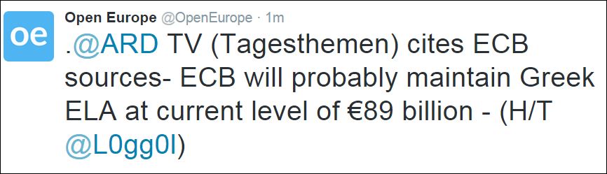 ARD: Η ΕΚΤ θα διατηρήσει τον ELA στο επίπεδο των 89 δισ. ευρώ Enikos Newsroom 00:52, Δευτέρα 06 Ιουλίου 2015 οικονομία Σύμφωνα με πηγές της ΕΚΤ που επικαλείται το ARD η Ευρωπαϊκή Κεντρική Τράπεζα «πιθανότατα θα διατηρήσει τον ELA στο επίπεδο των 89 δισεκατομμυρίων ευρώ». Διαβάστε επίσης: Φάιμαν: Τώρα καλείται να κάνει προτάσεις η Ελλάδα ELA ΕΚΤ Μοιράσου το: σχολίασε κι εσύ (0 σχόλια) Ακολουθήστε το enikos.gr στο Google News και μάθετε πρώτοι όλες τις ειδήσεις Δείτε όλες τις τελευταίες ειδήσεις από την Ελλάδα και τον Κόσμο στο enikos.gr Ειδήσεις Ροή Ειδήσεων 39 λεπτά πριν Δημοσκόπηση Alco: Στο 23,6% η ΝΔ, στο 11,6% το ΠΑΣΟΚ – Η άποψη των πολιτών για αγρότες, εκλογές και Τσίπρα 4 ώρες πριν Κυψέλη: Για πρώτη ημέρα βρισκόταν στο σχολείο η 16χρονη που επιτέθηκε με μαχαίρι στην 14χρονη – Τι αναφέρουν μαρτυρίες μαθητών για το επεισόδιο 1 ώρα πριν Φοινικούντα: Αρνούνται τις κατηγορίες οι 2 συλληφθέντες – «Θέλω να συμβάλλω στην αποκάλυψη της αλήθειας» λέει ο ανιψιός του θύματος 3 ώρες πριν Κρήτη: Εντοπίστηκε στίγμα του 33χρονου γιατρού που έχει εξαφανιστεί μέσω νέας τεχνολογίας που εφαρμόζεται για πρώτη φορά στην Ελλάδα 3 ώρες πριν Ρομπ και Μισέλ Ράινερ: Συνελήφθη ο γιος τους ως ύποπτος για την δολοφονία τους 5 ώρες πριν Τα 3 ζώδια που θα έχουν τύχη «βουνό» έως τις 21 Δεκεμβρίου – «Η ανατροπή που περιμένετε πλησιάζει» 2 ώρες πριν Γάμος: Αν ένας άνδρας νιώθει βαθιά μοναξιά, θα αρχίσει να κάνει αυτά τα 11 πράγματα μέσα στο σπίτι 43 λεπτά πριν Πώς να μην μαραίνονται γρήγορα τα κομμένα λουλούδια: Το λάθος στην τοποθέτηση του βάζου που πρέπει να αποφεύγετε 6 ώρες πριν Επιστήμονες του CERN έλυσαν ένα μυστήριο δεκαετιών της σωματιδιακής φυσικής – Τι ανακάλυψαν 3 λεπτά πριν Παναθηναϊκός: Ξαφνικό πρόβλημα με Ναν 10 λεπτά πριν Μουσική και πάρτι σε όλη την Αθήνα την παραμονή της μεγαλύτερης νύχτας του χρόνου – Όλες οι δράσεις 16 λεπτά πριν Ουκρανία: Έπληξε ρωσικό υποβρύχιο στο Νοβορισίσκ με υποθαλάσσιο drone – ΒΙΝΤΕΟ 23 λεπτά πριν Χάρης Βαρθακούρης: Η τρυφερή ανάρτηση για την επέτειο γάμου με την Αντελίνα Βαρθακούρη – «Η μέρα που (ξανά)παντρευτήκαμε…» 29 λεπτά πριν Μακρόν: Μεταβαίνει στο Βερολίνο για την Ουκρανία – Ευρωπαϊκή παρέμβαση στις συνομιλίες Ζελένσκι με τους Αμερικανούς απεσταλμένους ENIKOS NETWORK Πότε το χρόνιο ροχαλητό να αποτελέσει ένδειξη κινδύνου για την καρδιά; Τι λένε οι ειδικοί Μάριος Θεμιστοκλέους: Το ΕΣΥ ενισχύεται, εκσυγχρονίζεται, αλλάζει Ευλογιά αιγοπροβάτων: Έως το τέλος του έτους η οικονομική στήριξη 187 εκατ. ευρώ σε κτηνοτρόφους – Όλα όσα είπε ο Πρωτοψάλτ... ΔΙΜΕΑ: Πρόστιμα συνολικού ύψους 28.500 ευρώ σε 22 εταιρείες Σύγχρονος Νοστράδαμος: Προειδοποιεί για «μεγάλο γεγονός» τους επόμενους μήνες που θα συγκλονίσει τη Βρετανία και τον κόσμο Τεστ παρατηρητικότητας: Μπορείτε να βρείτε τις 3 διαφορές στις εικόνες με έναν πιγκουίνο σε 14 δευτερόλεπτα περισσότερα 13:00 , Δευτέρα 15 Δεκεμβρίου 2025 Δώρο Χριστουγέννων 2025: Ποιοι το δικαιούνται – Η online εφαρμογή της ΓΣΕΕ για να το υπολογίσετε μόνοι σας Διευκρινίσεις για την καταβολή του Δώρου Χριστουγέννων στους μισθωτούς εργαζόμενους του ιδιωτ... 10:50 , Δευτέρα 15 Δεκεμβρίου 2025 Συνέδριο «Ελληνικός Τουρισμός 2025, Μια εθνική υπόθεση!» – Νίκος Χατζηνικολάου: Το ελληνικό τουριστικό προϊόν έχει δύναμη, ποιότητα και διεθνή απήχηση Τη δύναμη, την ποιότητα και τη διεθνή απήχηση του ελληνικού τουρισμού ανέδειξε κατά τον χαιρετ... 08:57 , Δευτέρα 15 Δεκεμβρίου 2025 Τι αλλάζει σε διαθή