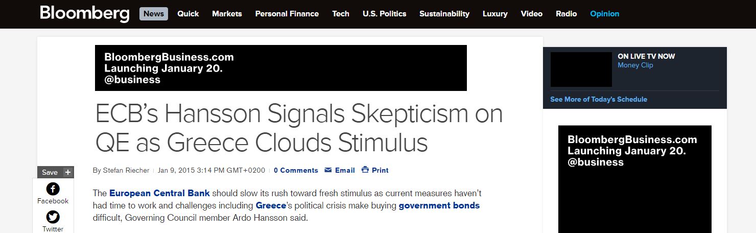 Την εξαίρεση των ελληνικών ομολόγων από ένα πρόγραμμα της ΕΚΤ για την αγορά κρατικών τίτλων από τις χώρες της Ευρωζώνης (γνωστό και ως QE), το οποίο ενδέχεται να ανακοινωθεί στις 22 Ιανουαρίου, ζήτησε με δηλώσεις του ο Άρντο Χάνσον, Διοικητής της Κεντρικής Τράπεζας της Εσθονίας και μέλος του Διοικητικού Συμβουλίου της ΕΚΤ.